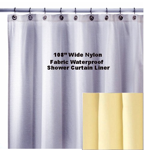Hotel Nylon Extra Long fabric Shower Curtain Liner The industry standard 200 denier nylon Unusually strong when combined with the Safe-T-Top header Can be used as a stand alone shower curtain or as a fabric shower liner. Durable and water repellent Repels water and resists stains Reverse bottom hem for smooth water run off. Machine washable and quick drying (Follow laundry directions sewn into every curtain) Features Safe-T-Top - Fabric shower liners are constructed with sewn button holes on a triple thick top hem consisting of a double layer of fabric plus an additional layer of tough nylon mesh SIzes: 108" wide x 72" long Available in White or Champagne Use for claw foot tubs Use for fuller shower curtains, curved or round shower curtain rods Purchase 2 sets of shower hooks